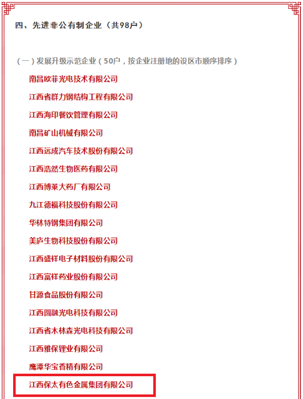 On June 28, 2018, the Jiangxi Provincial CPC Committee and theprovincial government praised "2015 / 2017 for the advanced units andindividuals in the non-public sector of the economy." Baotai Group wasawarded the title of "Advanced Units in the non-public sector of JiangxiProvince." Baotai Group is the only recognized advanced non-publicenterprise (development and upgrading demonstration enterprise) in YujiangCounty.